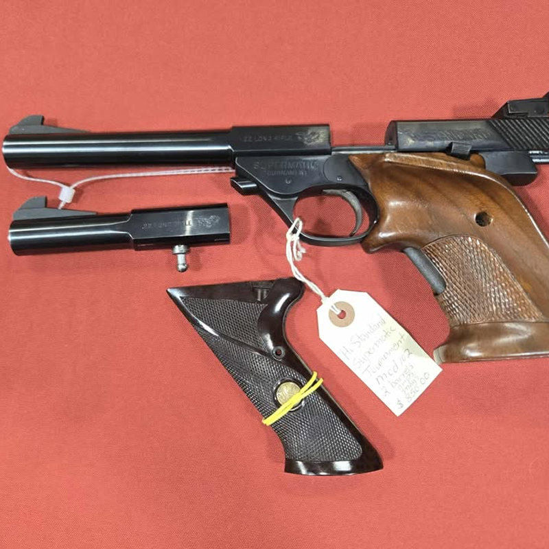 The High Standard Supermatic Tournament is a precision-built, semi-automatic pistol chambered in .22 Long Rifle, designed for competitive target shooting. Featuring a bull barrel, adjustable rear sights, and an ergonomic grip, it delivers exceptional balance and accuracy. Its crisp trigger and high-quality construction make it a favorite among serious marksmen and collectors of classic American firearms.